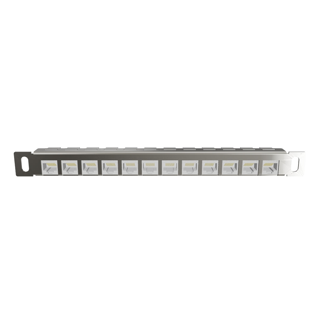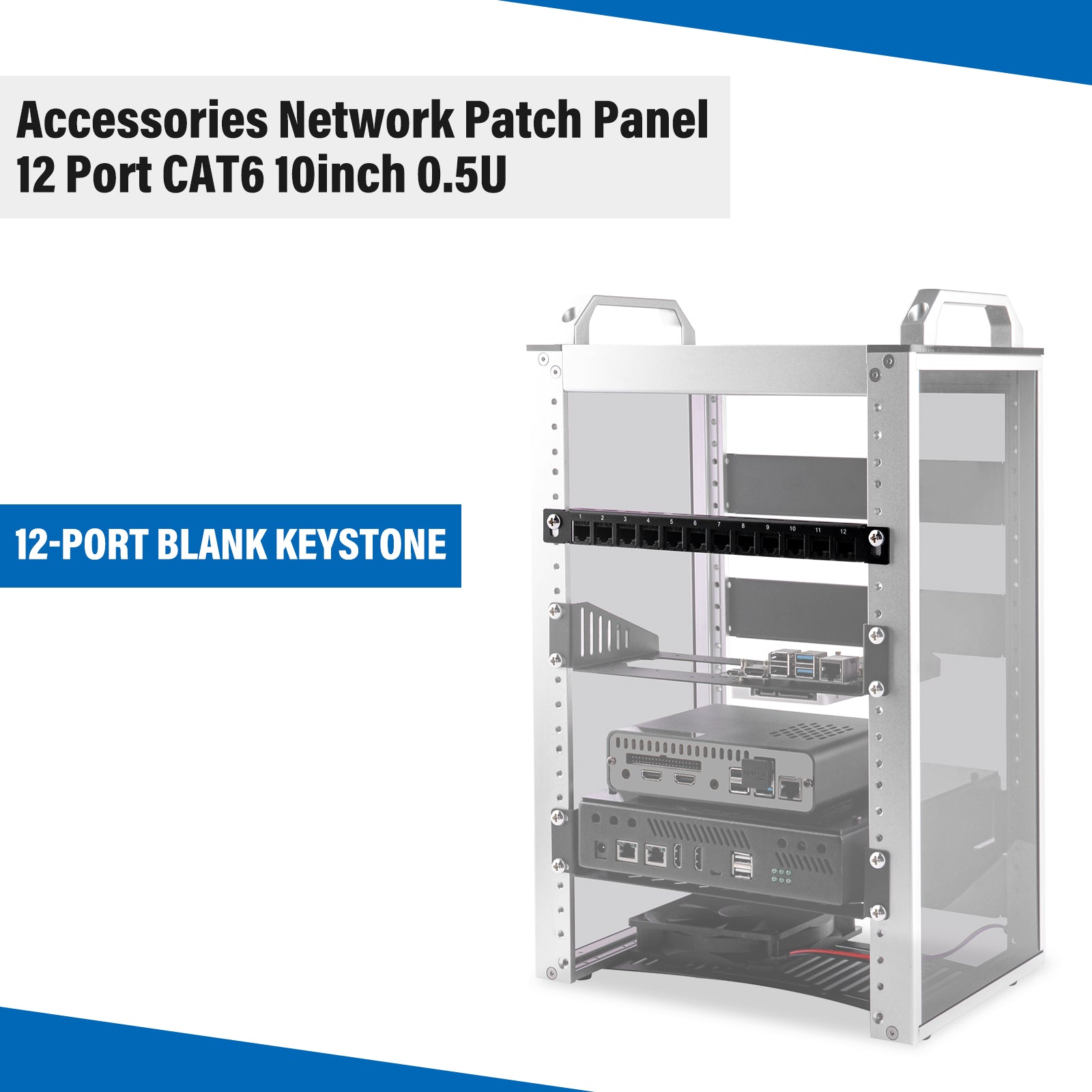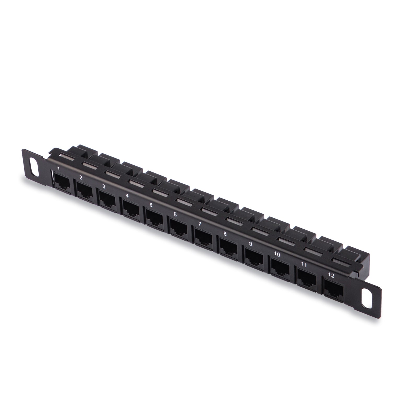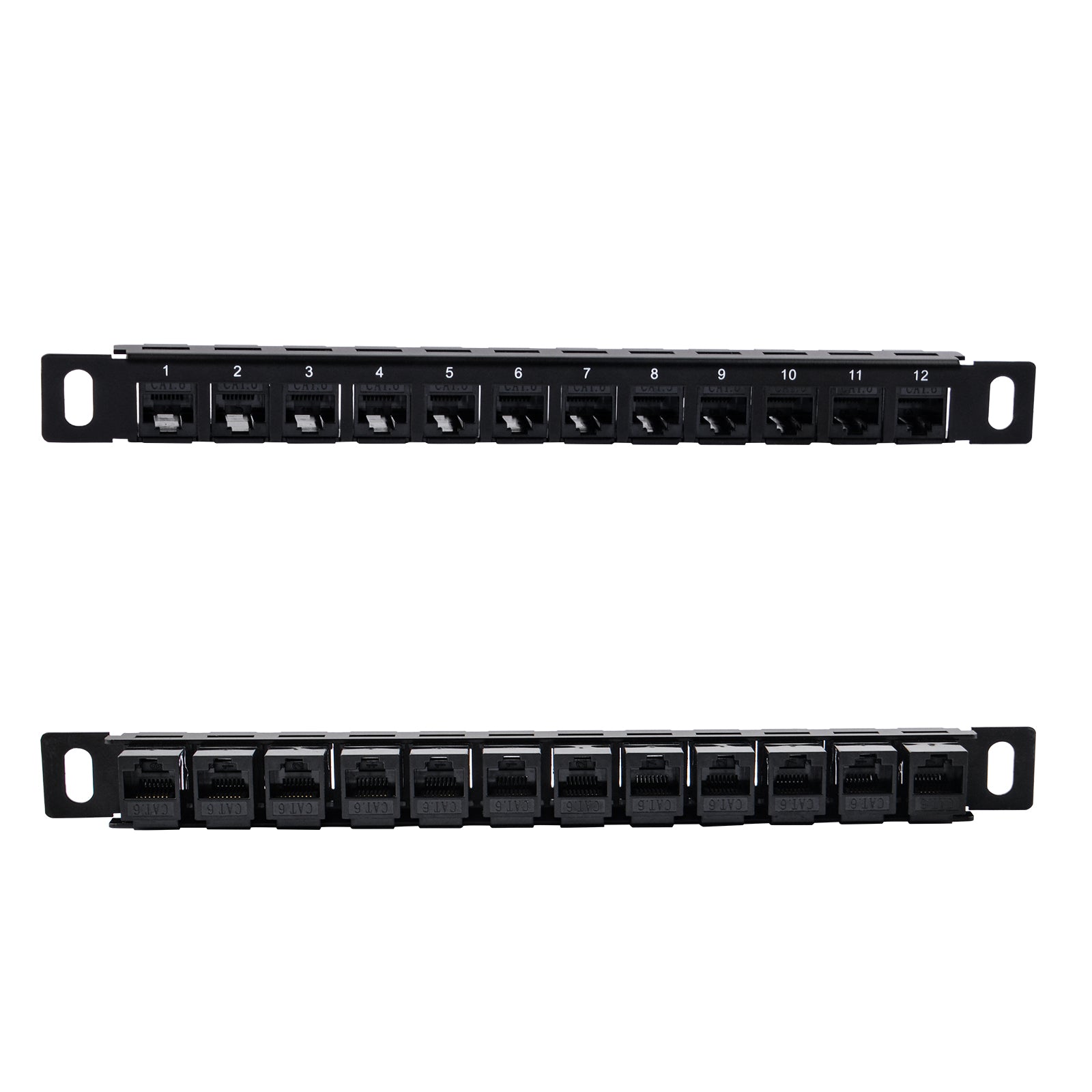 - 12-port Cat6 pass-through patch panel for easy cable connection without drilling holes.