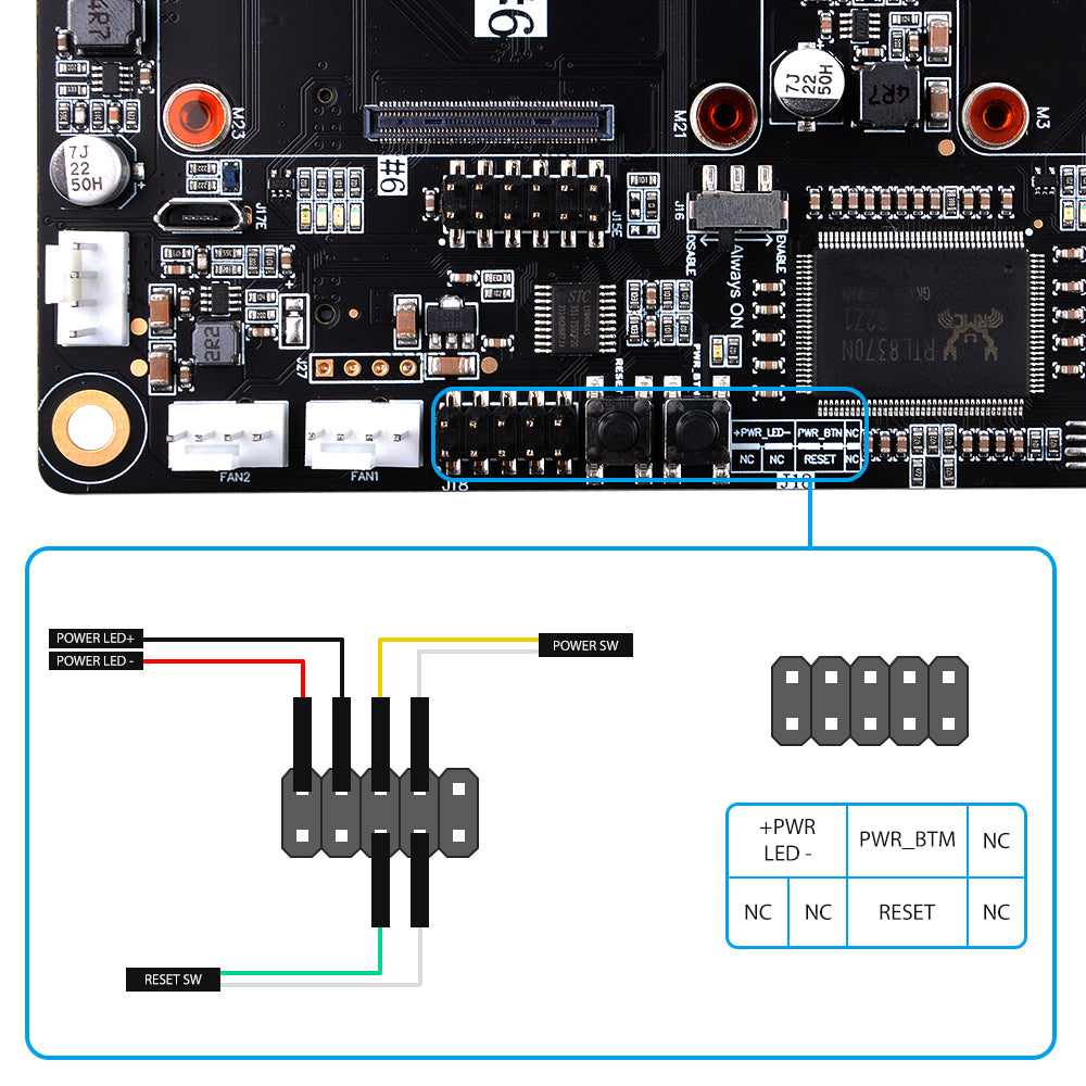 It also provides Power switch cable and Power LED cable and Reset cable which can connect to J18 Pin header to enable power button and reset button on front face.