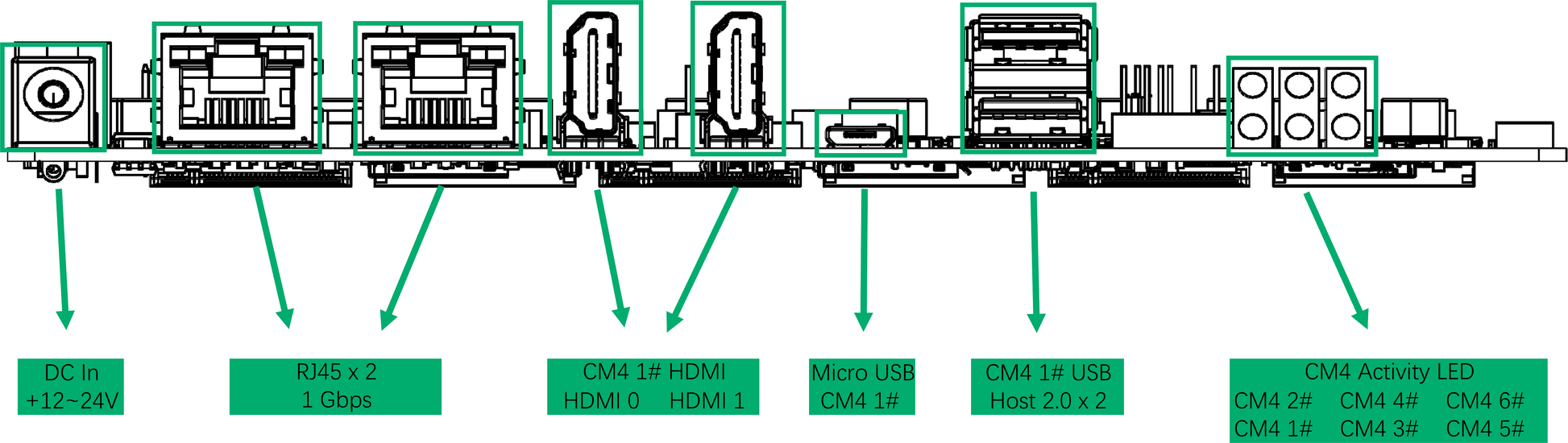 - There are 2 USB-A an 2 USB 2.54 Pins on the board. They only connect to CM4 1$. The two HDMI ports are also the same.