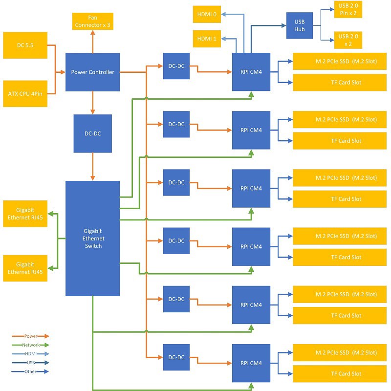 - NIC – There is an 8-port gigabit switch on the board. Each port goes to each node plus one uplink. Two RJ45 out are from the switch. You can use them connect to other network device without extern switch.
