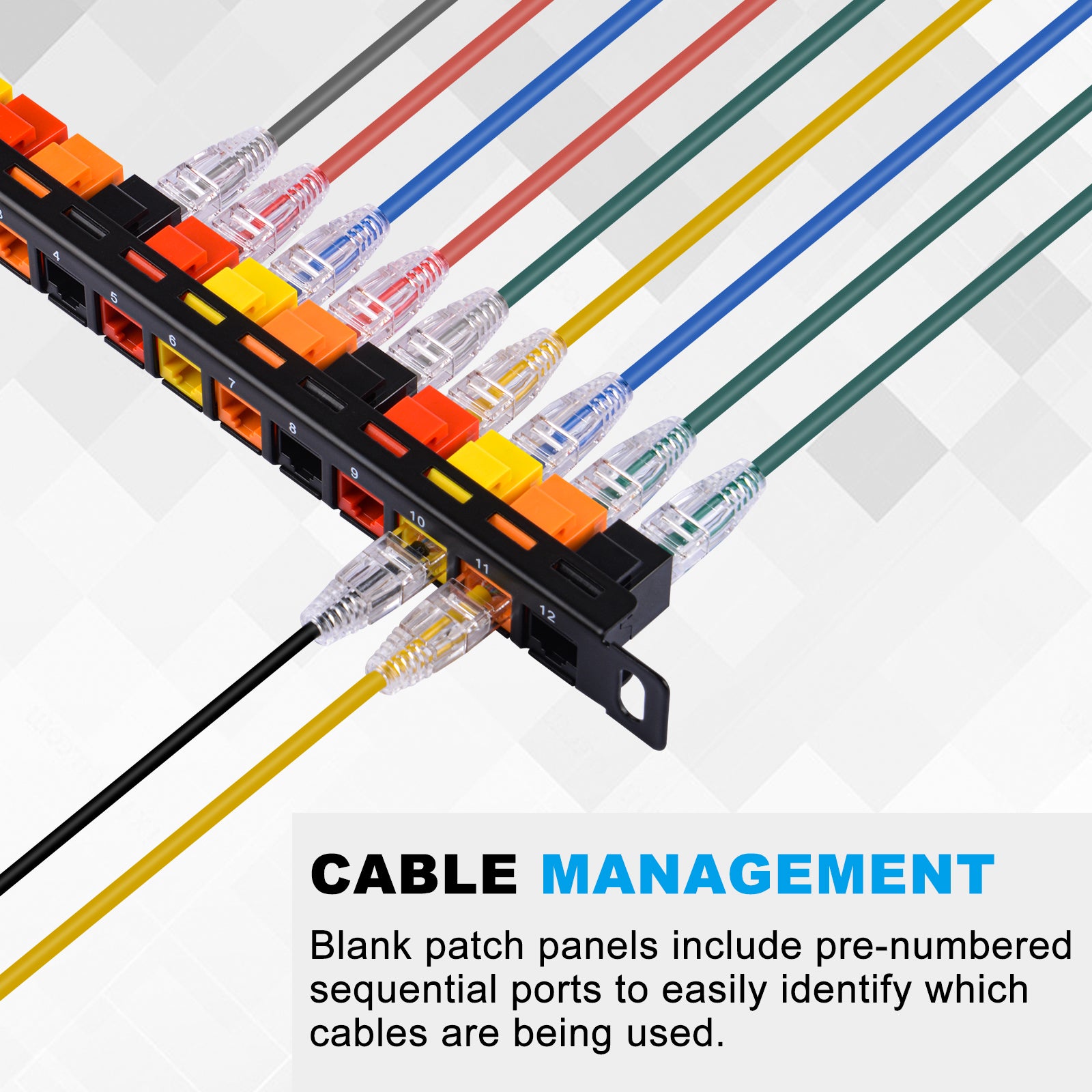 - Cable management: Blank patch panels include pre-numbered sequential ports to easily identify which cables are being used.