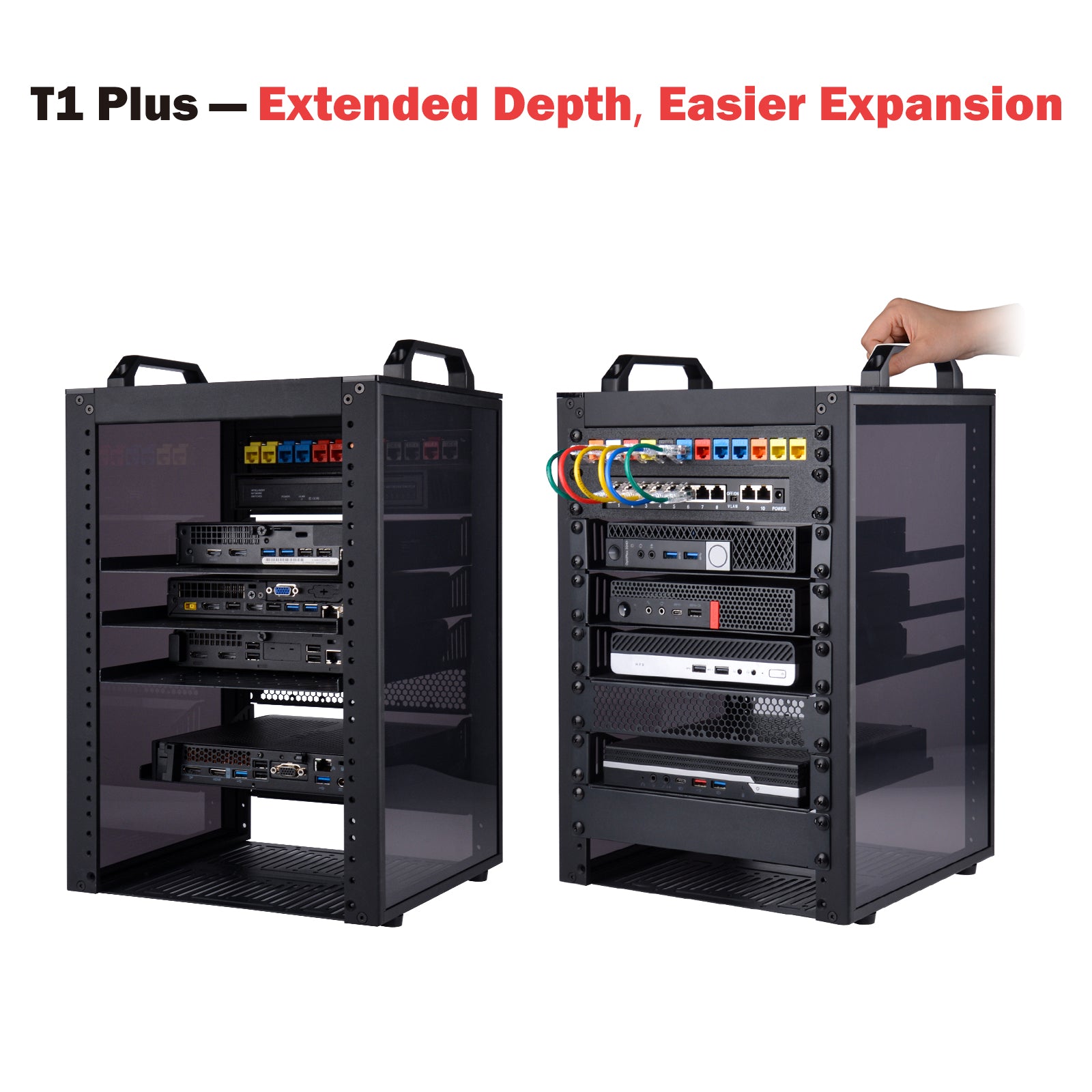 - 10-inch width: The cabinet has a width of 10 inches, which is a relatively small size that saves space while accommodating sufficient equipment. The T1 Plus is particularly well-suited for NAS devices with a depth of 260mm.