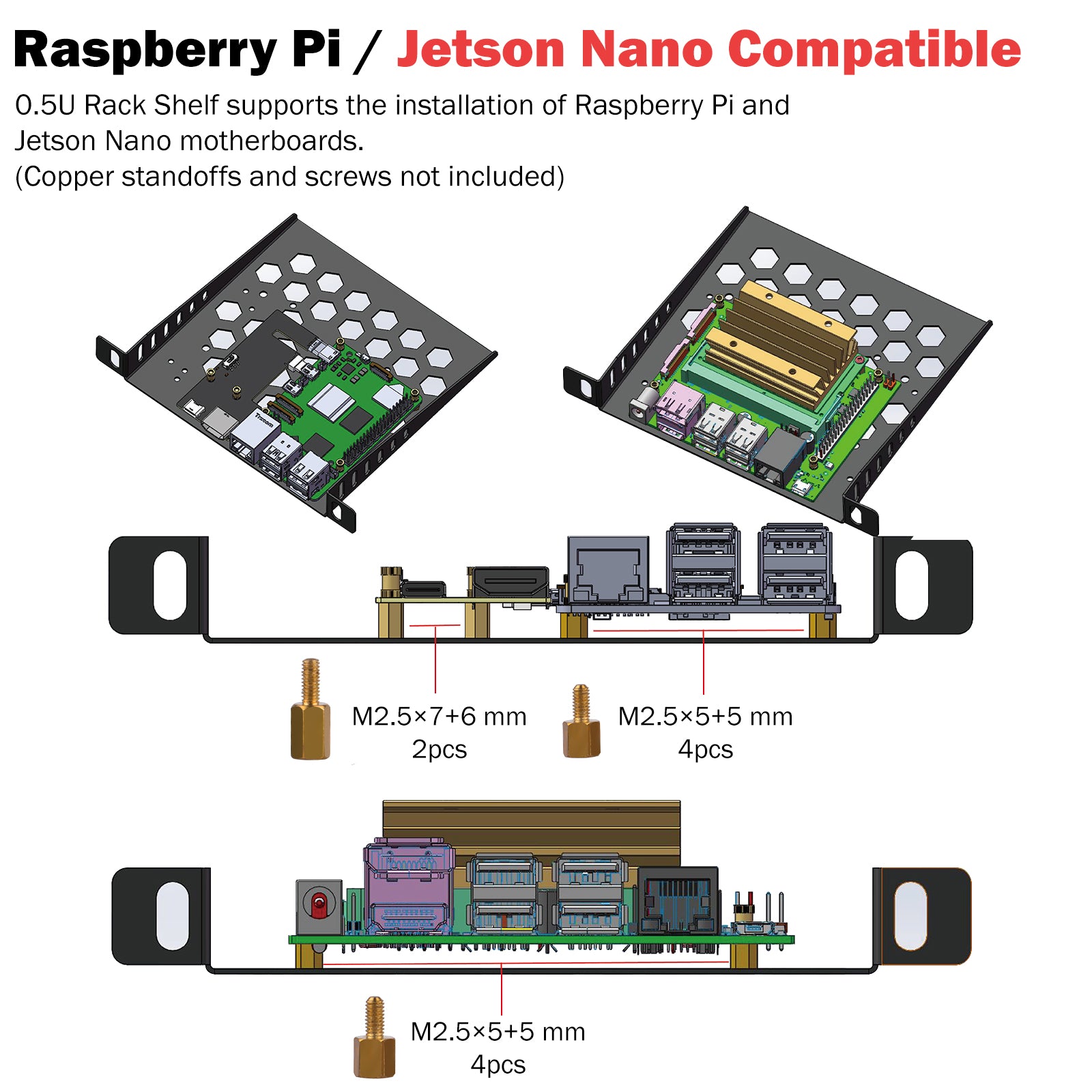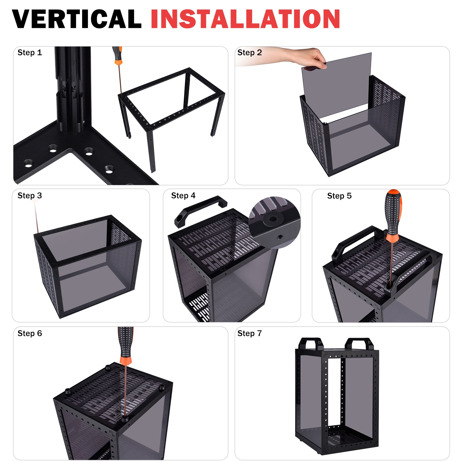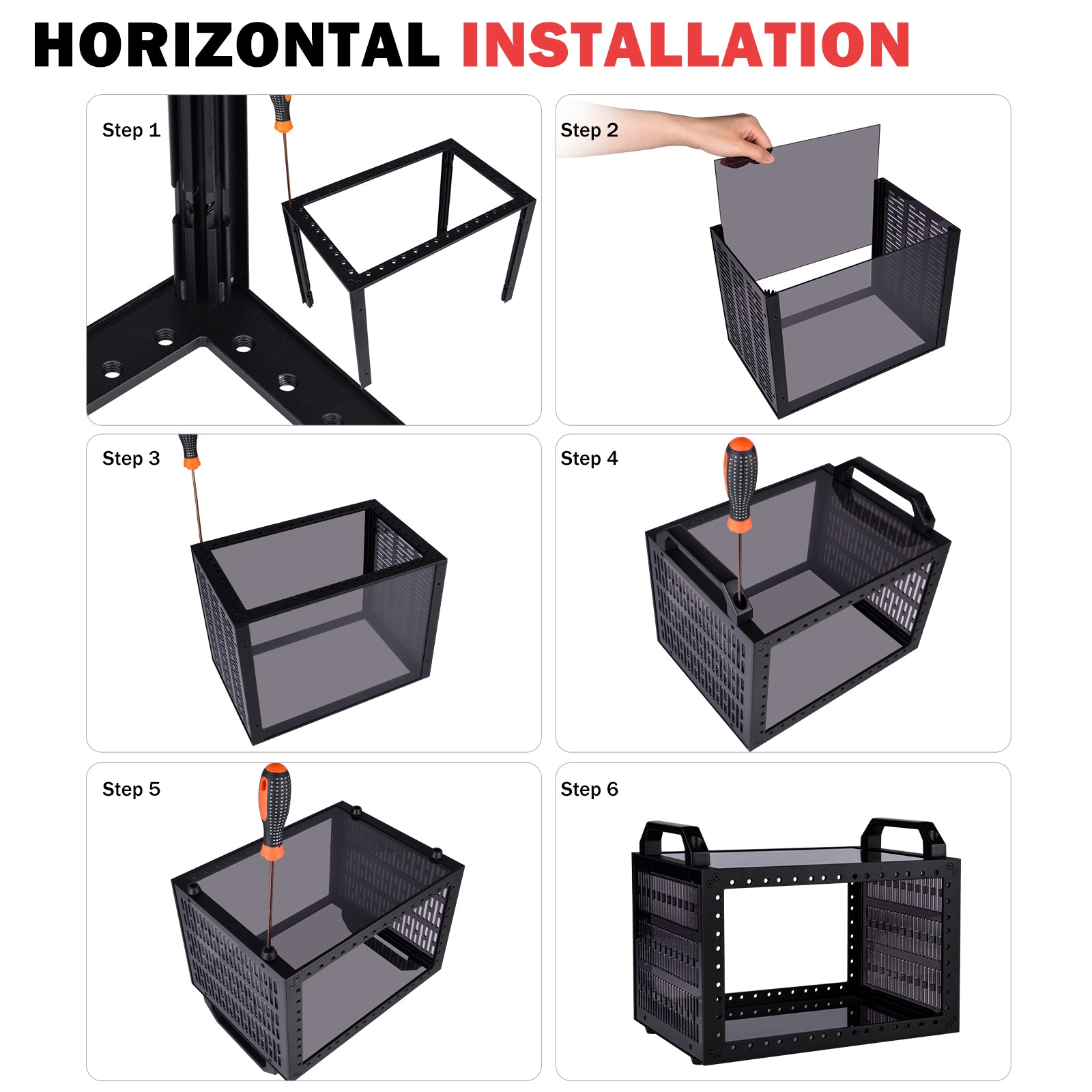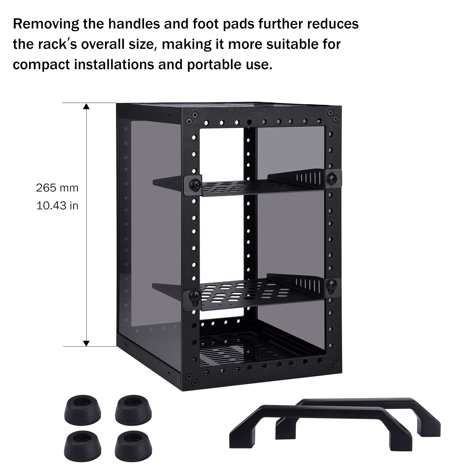 - Placed horizontally or vertically: 1. When placed vertically, it can hold four to five mini PC or mini devices. 2. When placed horizontally. By swapping the position of the handle and rubber feet, it can be placed horizontally, accommodating three layers of 1U devices inside. It will be a 10 inch 3U server rack and compatible with accessories of DeskPi RackMate T0/T1.